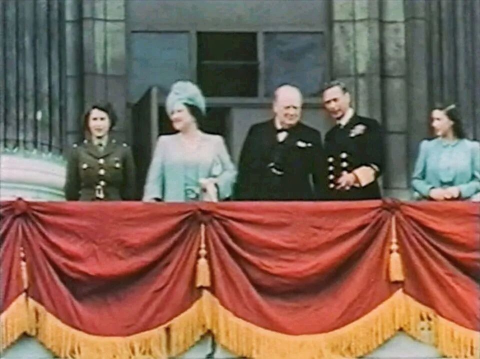1945年5月8日,欧洲胜利日,伊丽莎白公主、伊丽莎白王后、英国首相丘吉尔、乔治六世国王、玛格丽特公主(照片从从左到右),曾同时出现在白金汉宫的阳台上。那一天,英国一片欢腾。