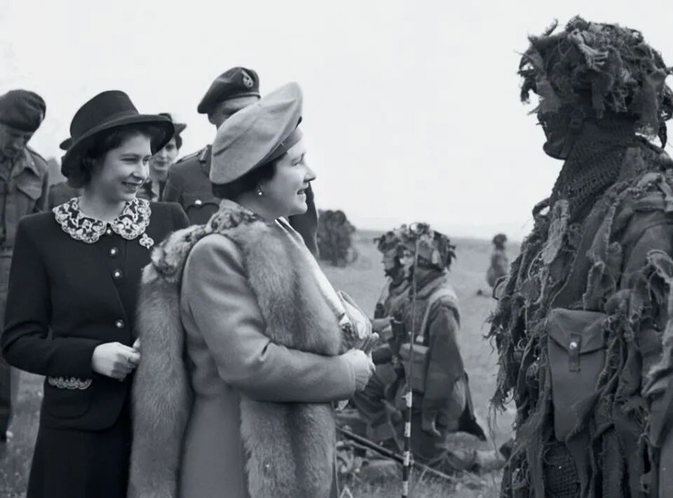 5月19日,公主跟在王后身后,视察了空降部队,并与全身伪装的狙击手进行了交谈。