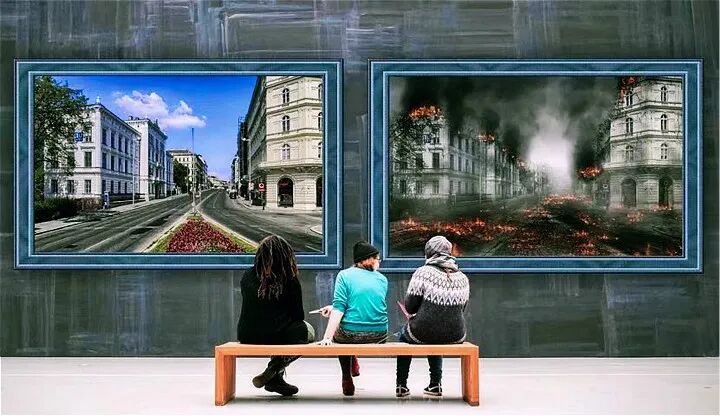 甚至于村舍窗户里的灯罩、桌布、窗帘、早餐、壁炉旁整齐叠放的衣服,都可以透过灰烬重现。
