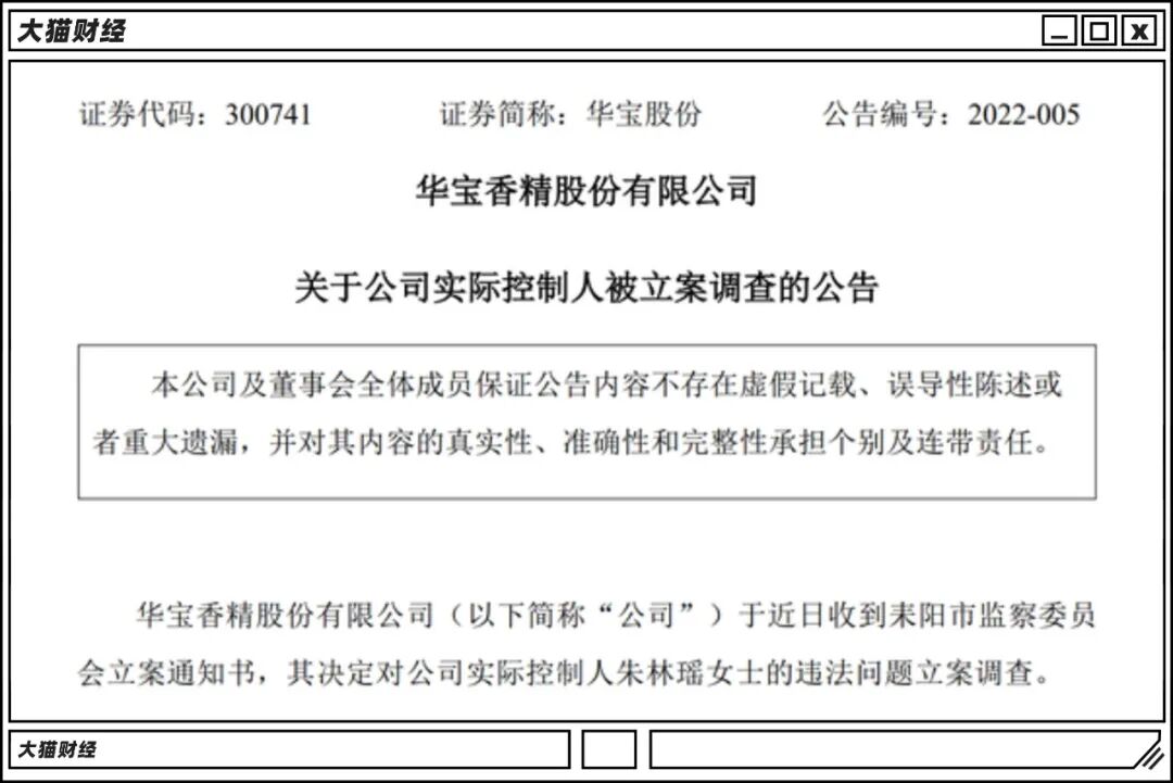 华宝股份的实控人朱林瑶因为涉及违法问题被立案调查。
