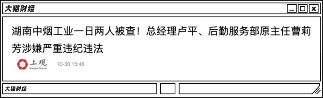2021年8月,湖南中烟党组成员、副总经理刘建福涉嫌严重违纪违法,主动投案;2020年10月,湖南中烟党组书记、总经理卢平涉嫌严重违纪违法,接受纪律审查和监察调查。