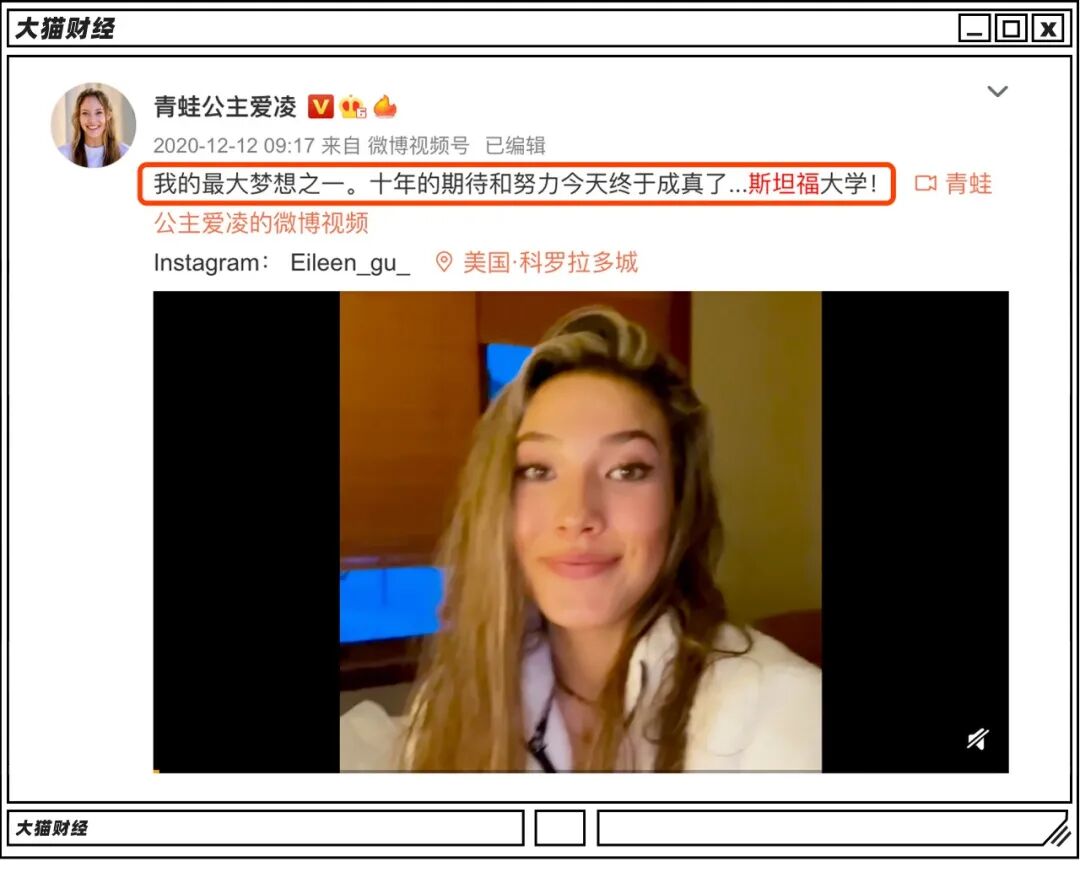 谷爱凌的社交媒体账户有“青蛙公主”几个字,爱美的女孩唯恐避之不及,2020年的12月,她发消息说,最大的梦想之一,进入斯坦福大学,终于成真了。