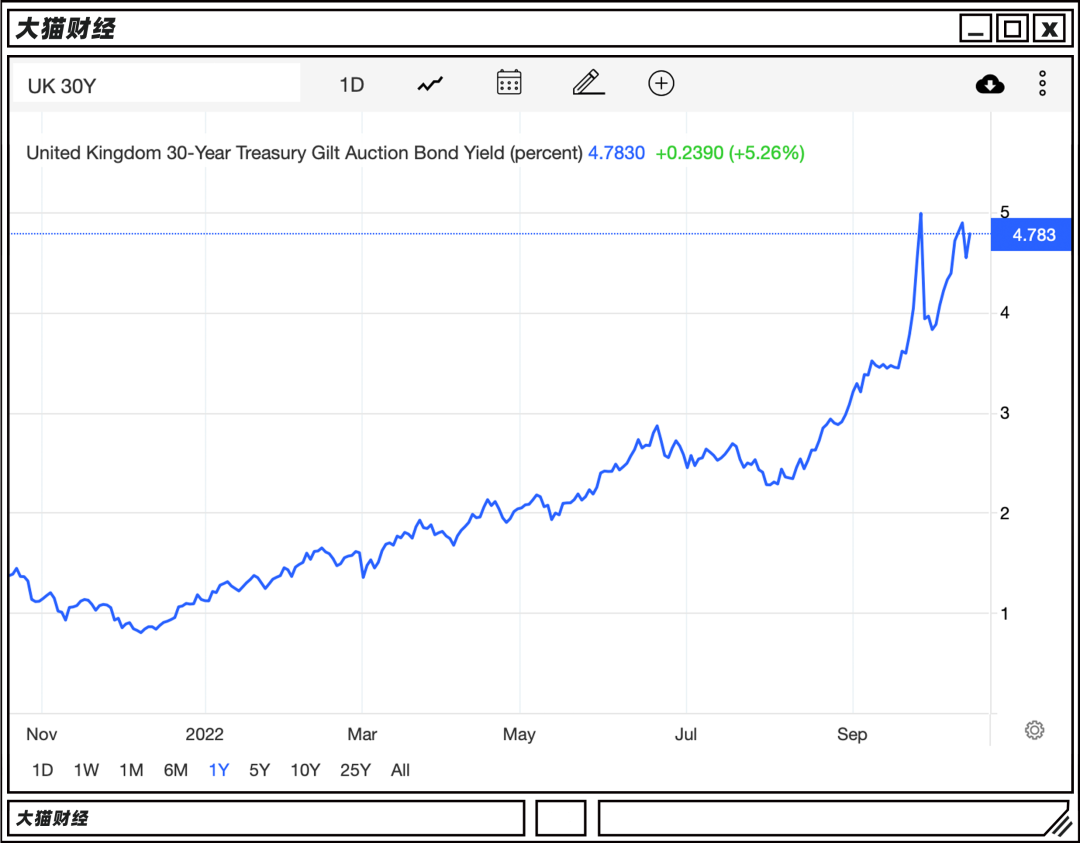 可自从新首相一手炮制的“减税计划”公布后,市场的信心就崩了。短短几天之内,英国30年期国债收益率飙升了120个基点,而英国10年期国债收益率则在一年内飙升超过300个基点。