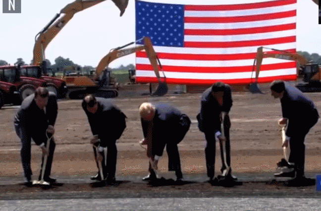 2018年,特朗普在威斯康星州出席了一个重要的动工活动,他用金铲子挖土,那叫一个金光闪闪: