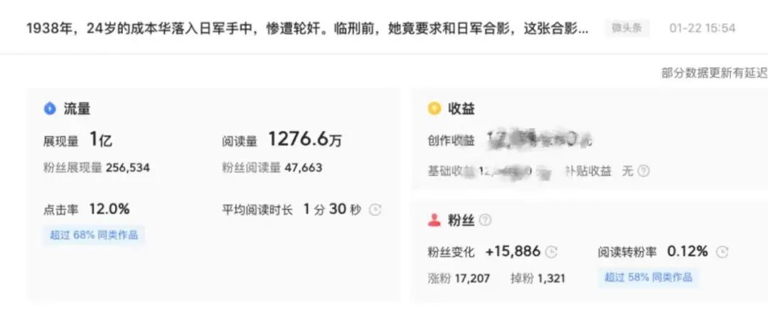 最让我惊喜的是,1月22日,一篇上稿在李砍柴的“女英雄成本华”,在发布后的4天时间内,居然突破1个亿的展现。