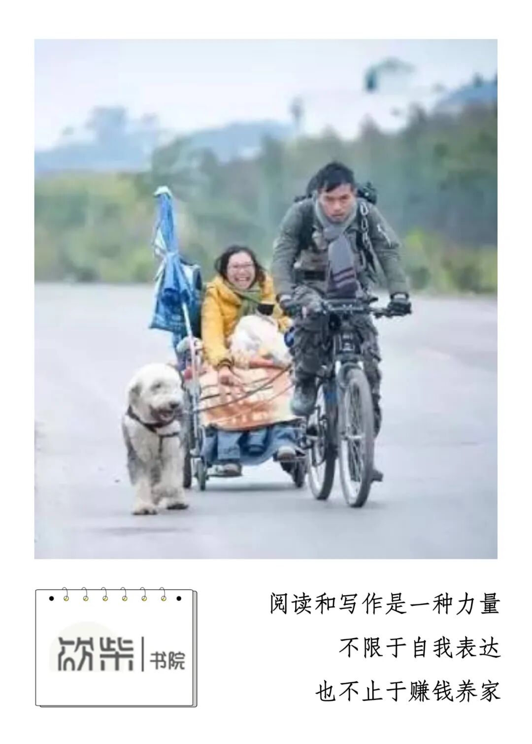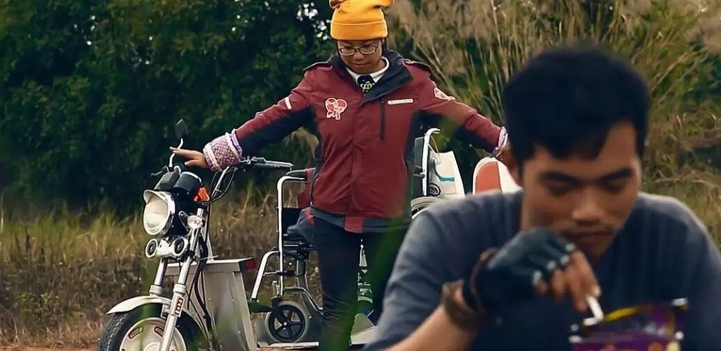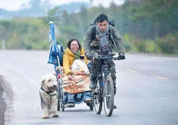 画面中,一个健康的男人骑着一辆山地车,车后拉着一个轮椅,轮椅上坐着一个身体并不健康的女子和一些生活杂物。