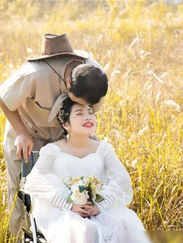 坐在轮椅上,穿着婚纱和高跟鞋的赖敏,哭得像个孩子。