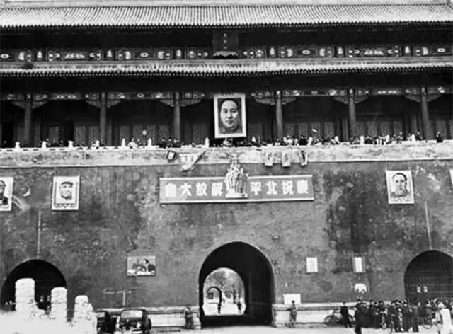 挂像中的毛主席,目光坚定,意气风发。挂像下方,写有“庆祝北平解放大会”的红色条幅,也仿佛染上喜悦的神采。
