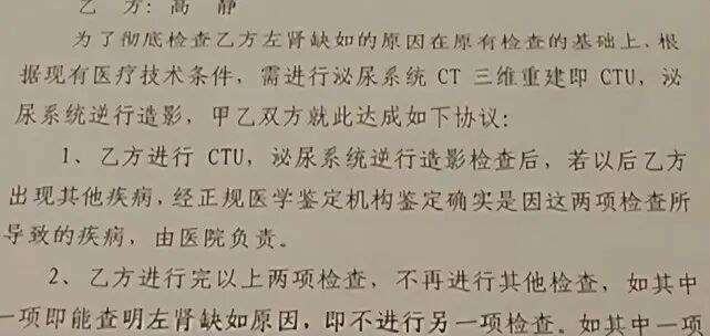 为了确诊,高父带女儿高静先后到延安市人民医院、西安市第四军医大学、西京医院进行B超与CT检查均示:左肾缺如、左肾未探及,左肾区及盆腔均未见正常左肾结构等结果。