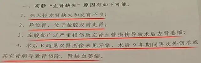 院方认为,之所以出现这样的情况,要么是高静先天性左肾缺失和发育不良,要么是异位肾或者游走肾;也有可能是高静手术后导致的肾脏萎缩,或者其他肾病导致肾脏被切除、肾萎缩。