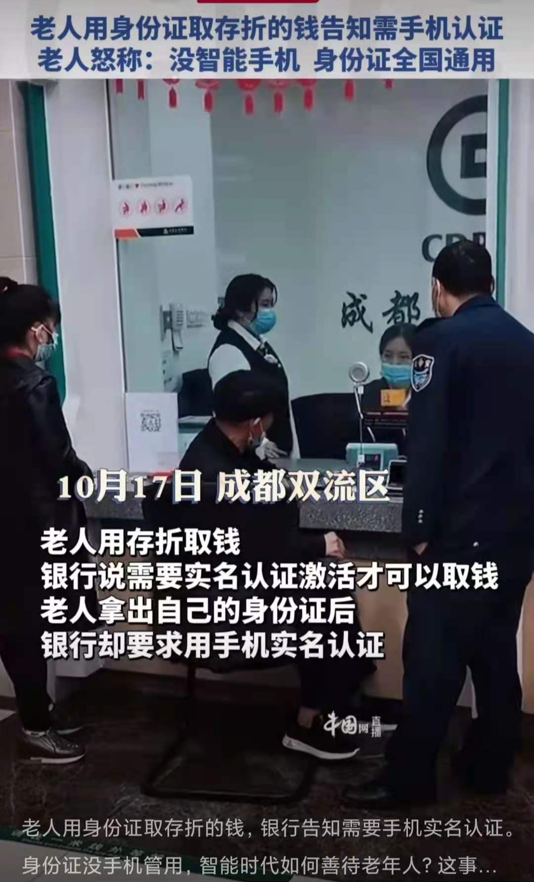 17号上午,一位老人去成都一家银行取钱。他提供了存折和身份证,却被告知没有手机认证不能取钱。