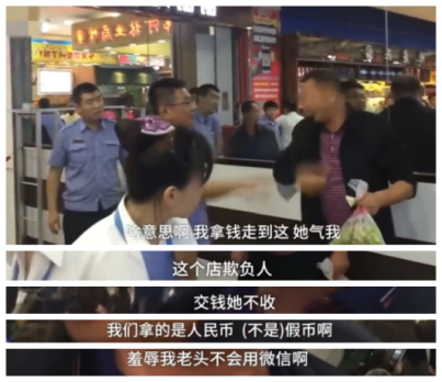 一位老人在超市买葡萄。排了长长的队伍,到柜台了却被拒付,原因是超市不收现金。老人气得到处找人论理,并感觉到羞辱。
