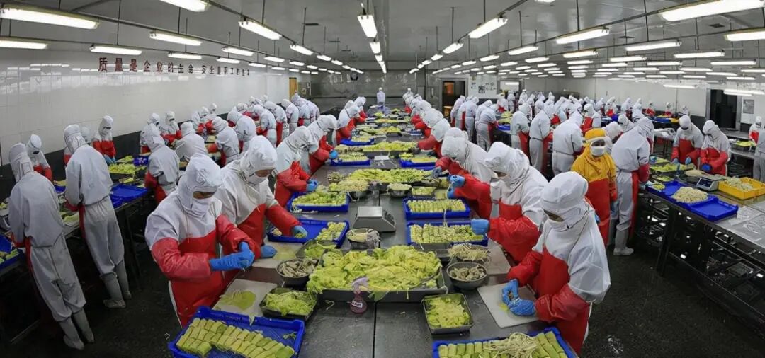 车间里,工人们穿着干净的隔离服,带着手套,车间物品摆放整洁,腌制食品的地方也非常好,甚至连浸泡食品的水都干净透明。