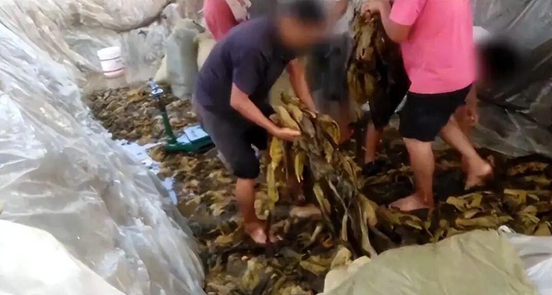 插旗菜叶公司的芥菜从田地里采摘回来,没有经过清洗就腌制,工人光脚站在酸菜上,随意踩踏,烟头也直接丢在酸菜上面。