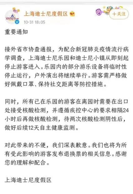 10月31日下午6点05分,上海迪士尼度假区接到协查通报,立刻发出通知,要求即刻起停止游客进入,所有在园的游客离园时,必须在出口处接受核酸检测。