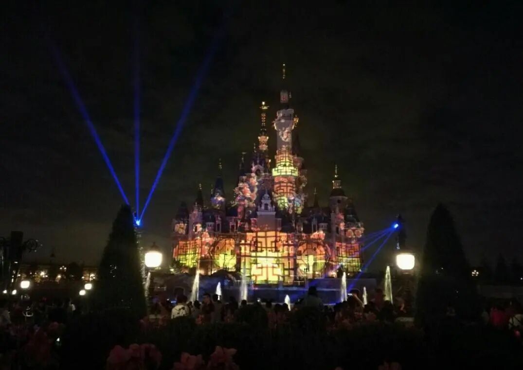 园区灯光依然闪亮,城堡在五颜六色的灯光映衬下,更加梦幻。