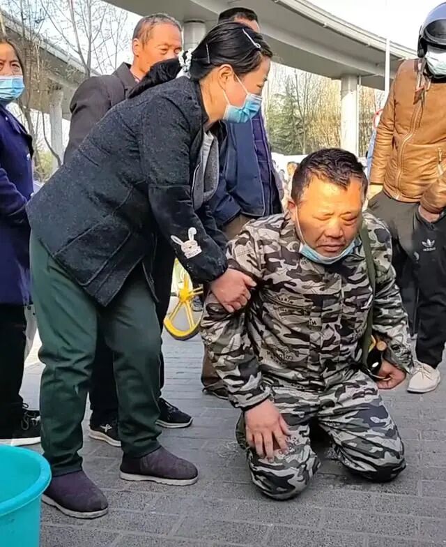路人同意后,男人突然双膝一跪,双手伏在腿上,低头哽咽了起来。
