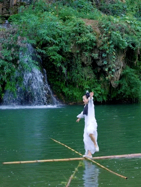 没有威亚,没有外力,只靠两根竹子,就能“一苇渡江”,撑起全场。