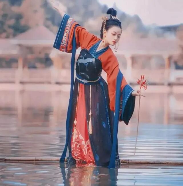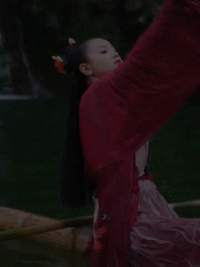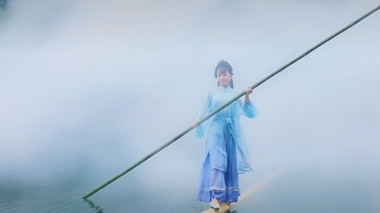 画面中,绿水青山,烟波浩渺,只见一位红衣女子身着汉服,脚踏楠竹,仙气飘飘地顺流而下。