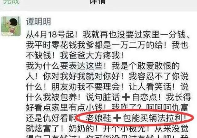 原来,1997年出生的谭明明是一个名副其实的富二代。