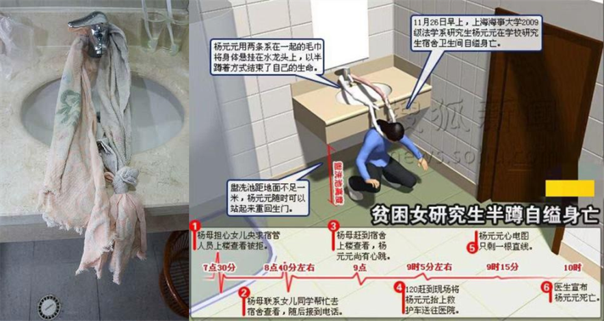 只见一位女同学半蹲在卫生间里,将两条毛巾系在一起,一边挂在卫生间水龙头上,另一边套在脖子里,早已没有了生命体征。