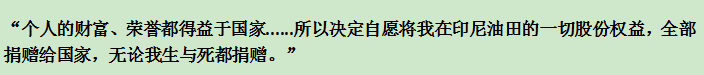 10月,他写下一份印尼油田的捐赠书,这块油田他占有40%的股份,按10月12日的原油价格计算,足足有2520亿元之多。