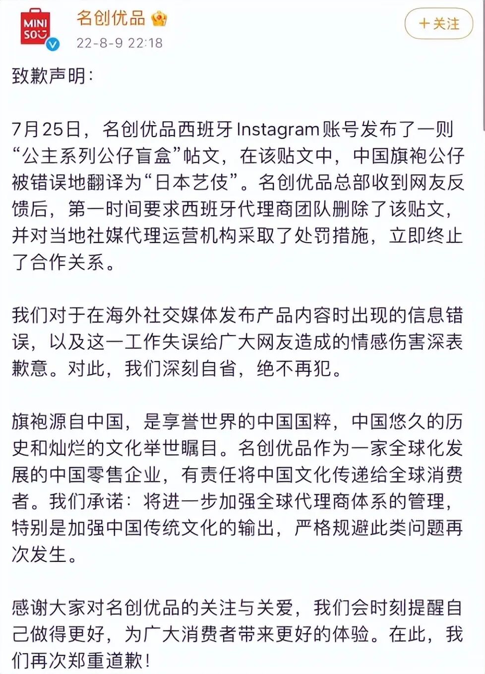 名创优品自然知道民意不可违,事情发酵没多久,名创优品就发布了致歉声明。
