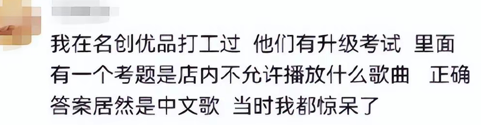 “我在名创优品打工时,升级考试内有个考题是店内不允许播放什么歌曲,答案居然是中文歌,当时我都惊呆了。”