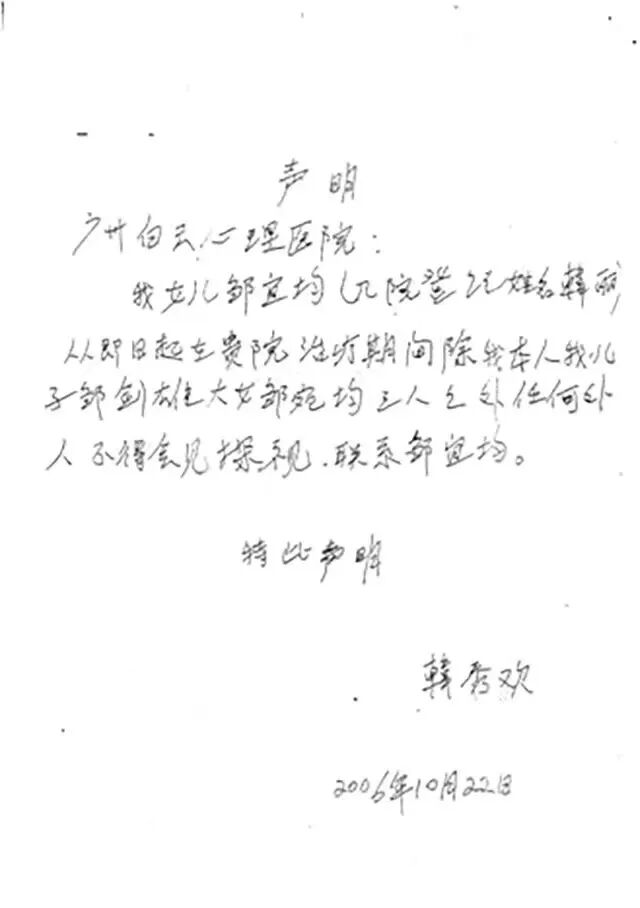 原来邹宜均被强制入院后,母亲已经将她的名字改了,并写了一个声明:女儿邹宜均(住院时姓名为韩丽),在住院期间,除了我和儿子以外,任何人不得会见、探视。