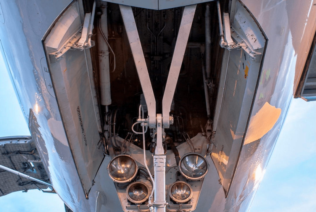 接着,起落架开始往舱内回收,梁攀龙顺着起落架往上爬,爬回了起落舱内的安全位置。