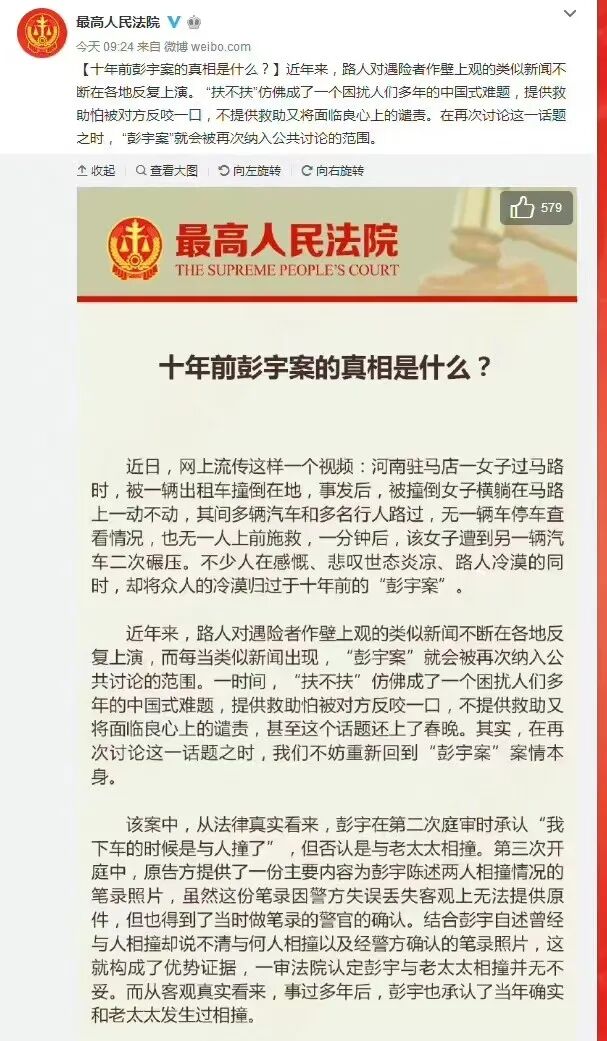 就在2017年6月 15日,最高人民法院在微博上发表了一篇名为《十年前彭宇案的真相是什么?》的长微博,“彭宇案”的真相才浮出水面。
