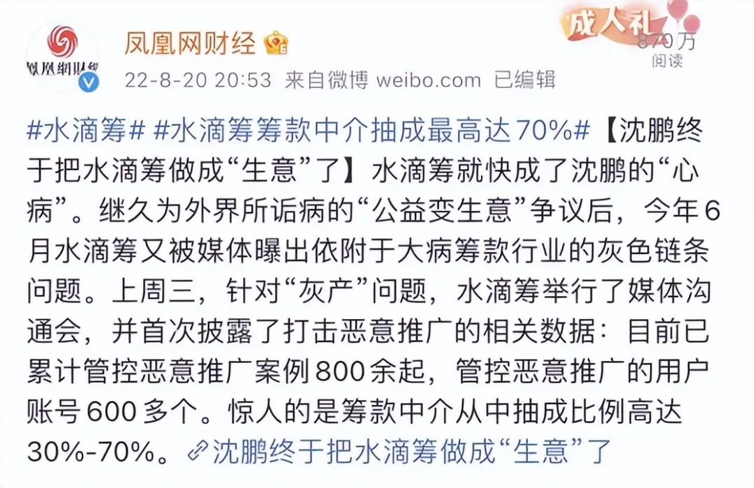 前不久,媒体爆料水滴筹上有中介搞恶意推广,从中抽成比例最高竟占善款七成!