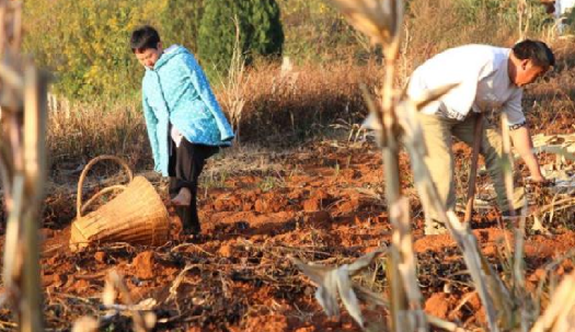 在田地里,两人互相配合,张顺东用一只手举起锄头,用力往土地里挖,把红薯刨出来,妻子在一旁则用脚夹起红薯,扔进背篓里。