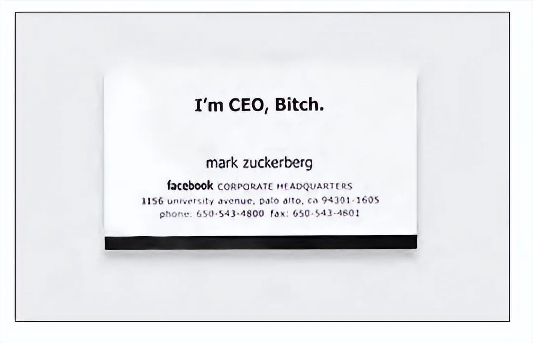 年轻时扎克伯格的名片上面写着“I'm CEO, Bitch”(傻 x, 我 可 是 CEO)这种带有这几分“中二”的话语让我相信他也是一个活生生的人,不是机器人,也不是“神”。