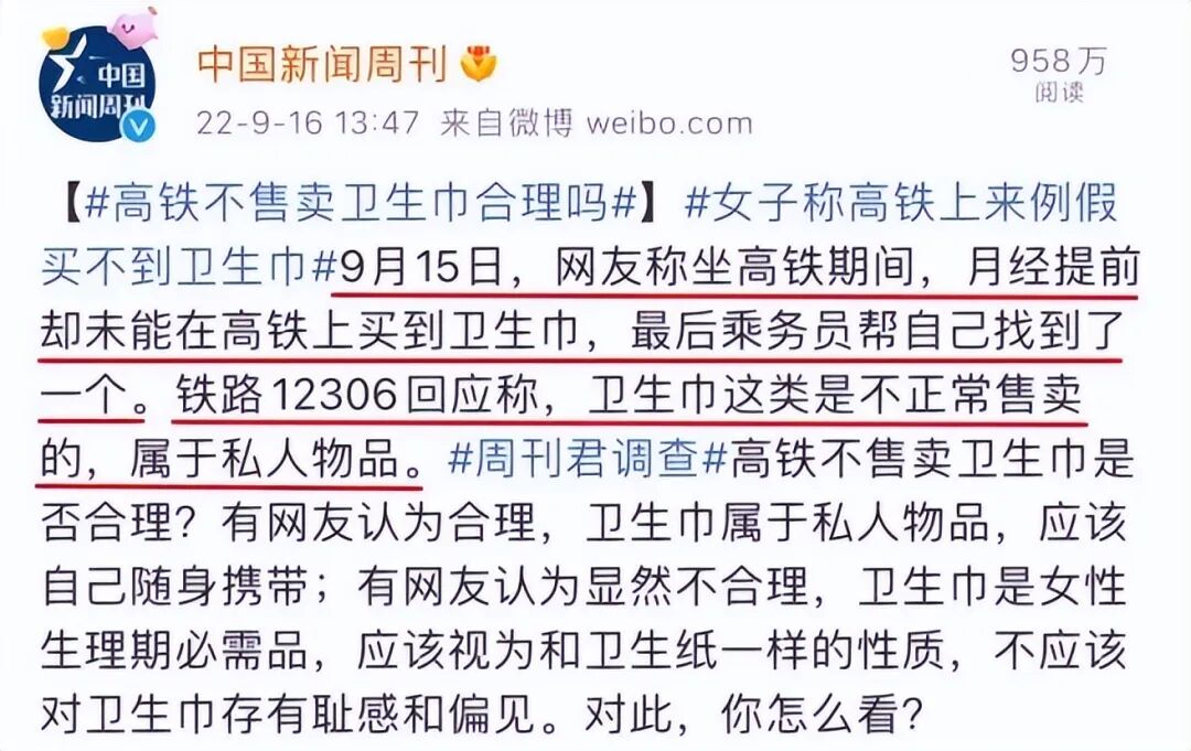回到本文开头,卫生巾该不该在高铁售卖,这本不应成为问题。