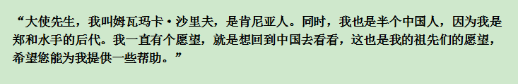 郭崇立大使不敢相信自己的眼睛,他努力搜寻着数百年前的历史,郑和船队的确到过肯尼亚,不过,真的有中国水手留在这里吗?