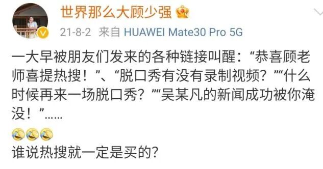再次受到关注,顾少强没像当年那般厌烦,反而很是高兴,特意发微博庆祝自己没花钱就能上热搜。
