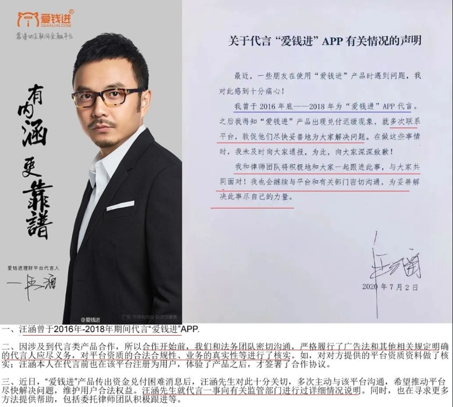 但可惜的是,他代言的理财APP,涉嫌非法集资诈骗,汪涵的人设崩塌,汪涵因此被大众拉入黑名单,公信力碎了一地。