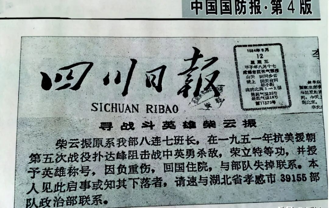 部队连续找了几年,依然毫无头绪。但是负责寻人的军史组成员并没有放弃,他们一方面在各大主流报纸上的头版显著位置刊登寻找柴云振的启示,希望找到蛛丝马迹,同时又派出寻访组奔赴各地找人。