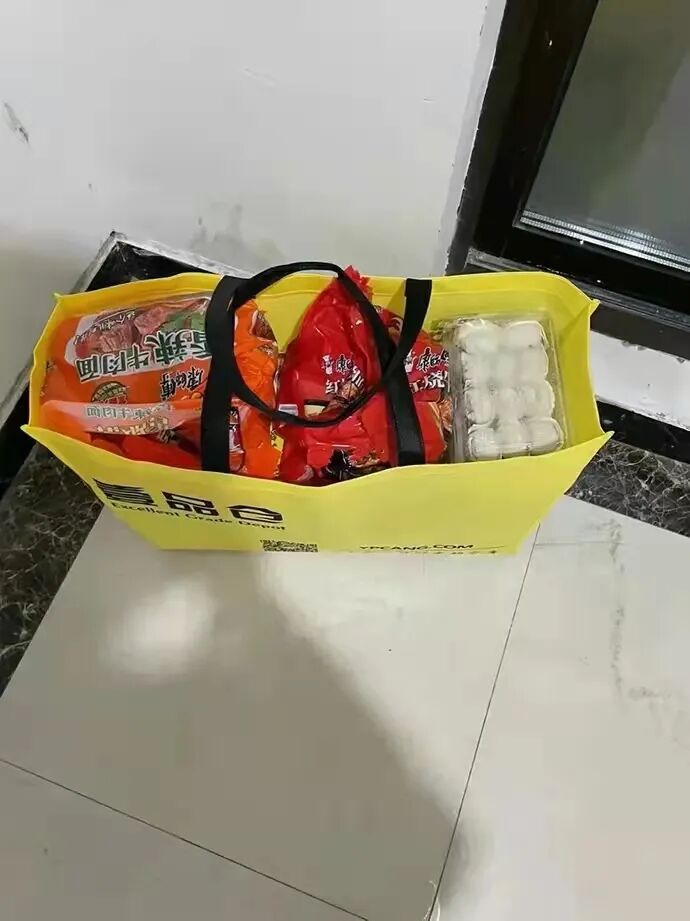 他们纷纷拿出了家里本就不多的生活物资,把热水、水饺、方便面、牛奶等生活用品,给楼下的司机师傅送了过去。