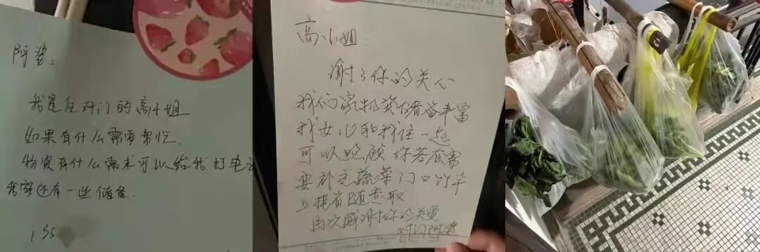 阿婆用一张纸条,工工整整地写着:谢谢你的关心,我们家的物资储备还是比较充足的。你若需要补充蔬菜,可以在门口的竹竿上随意拿取。