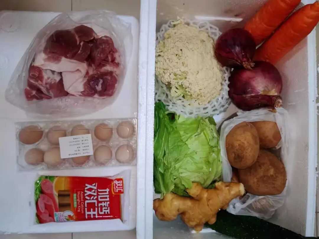 这就是我们领到的生活物资,有肉、有蛋、还有各种蔬菜,新鲜而洁净。