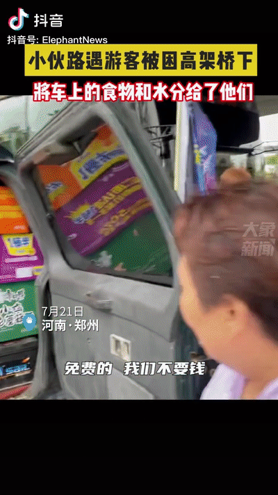 在路上,看到有游客被困在桥上,还主动将车上的食物和水送给他们,他说“免费的,我们不要钱”。
