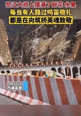 前几天,在西藏昌都怒江大桥桥边,不少游客自发地在大桥上摆满了鲜花水果和饮料,鸣笛致敬当年牺牲的筑桥英雄。