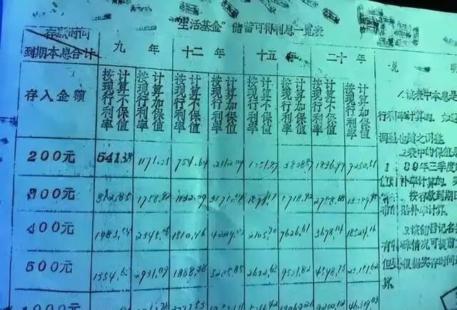 表上的存款数额从200元到1000元不等,存期有9年到20年四档,计息方式则分为两种,按现行利率不保值和按现行利率加保值。