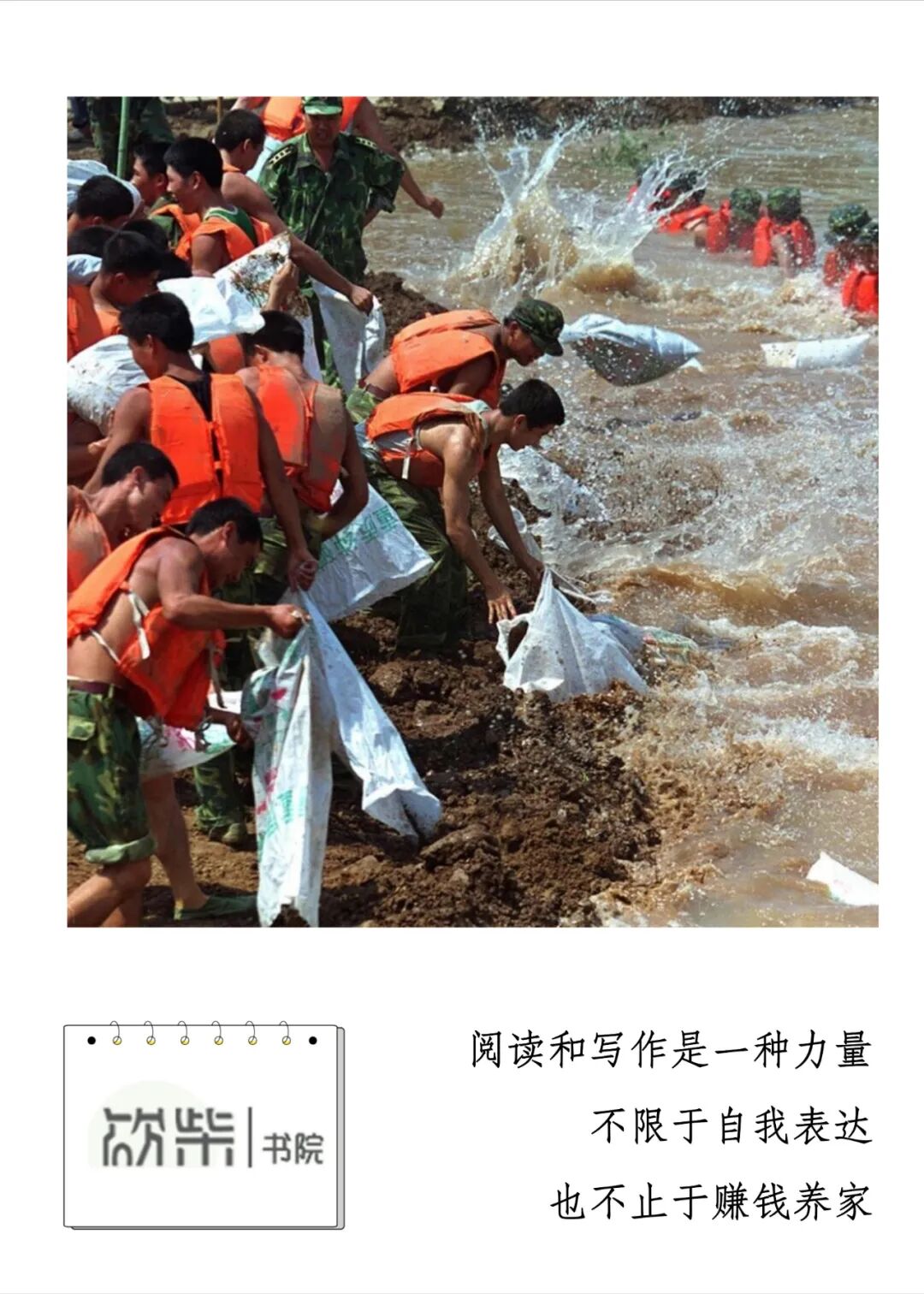 “为了减轻风浪对大堤的毁坏,他们跳入洪水中,用血肉筑起防洪大堤。”