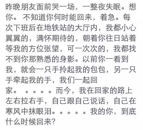 她在微博里写:“我在回家的路上,左手拉右手,自己和自己说话,自己在寒风中抹眼泪……我的你,到底什么时候回来?”