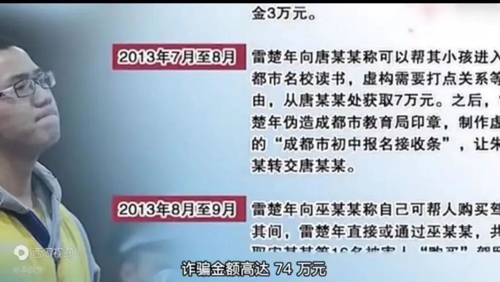 雷楚年的干爹李云成的儿子想上四川大学,可分数不太够,雷楚年便称他与教育局的人相熟,从李云成那里骗来了22万的“打点费”。