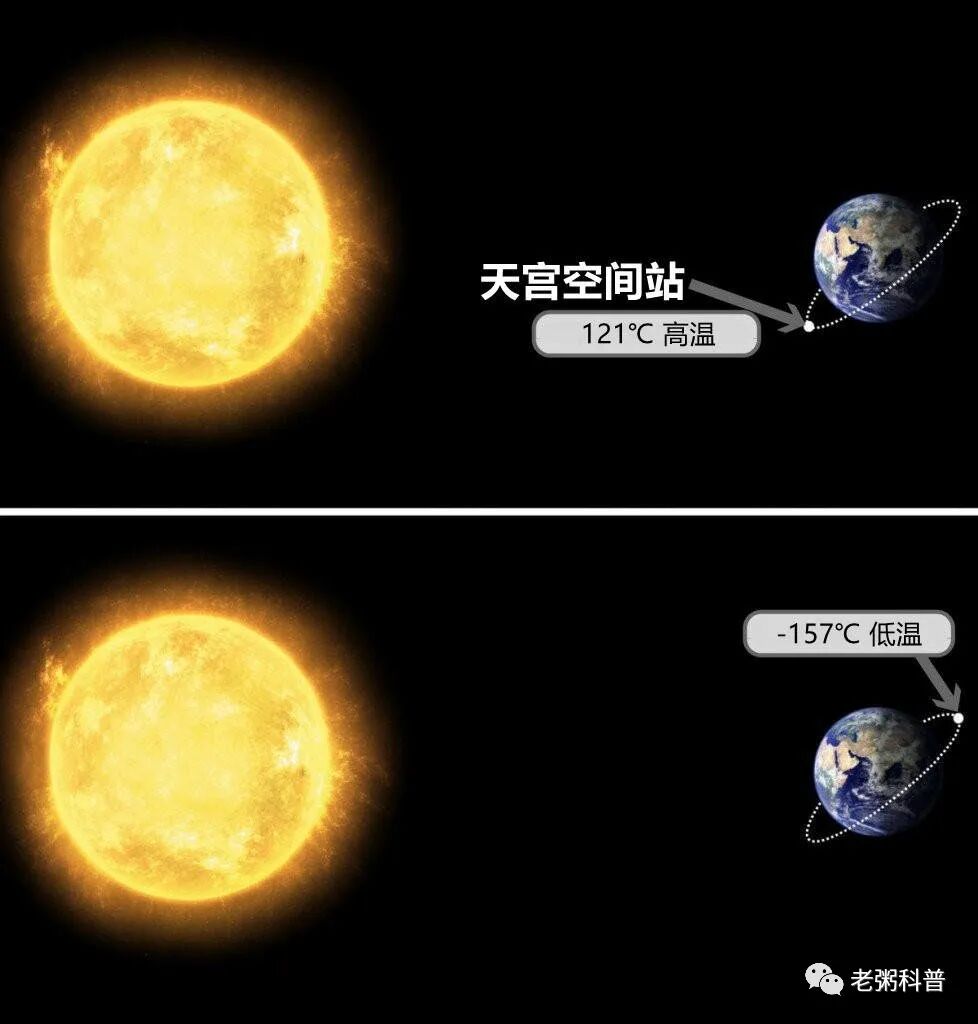天宫空间站运行在离地面约400公里高的近圆轨道上,这里空气极稀薄,接近真空。由于强烈的太阳辐射,空间站向阳的一面温度高达121℃,而当空间站转到地球背阴面时,它表面的温度一下子降到零下157℃,可以说是冰火两重天。