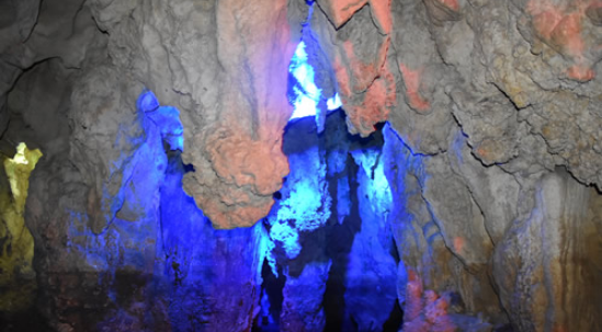 (2)、洞中寺院——龙宫观音洞。观音洞,总体面积达2万多平方米,其特点就是所有的殿堂都是天然溶洞。人工雕刻佛像32尊,其中观音像高达12.6米,主殿上有一天然神似观音的钟乳石,天然和人造的佛像浑为一体。